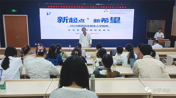 在新生入学教育中,王京副院长首先对于研究生新生的到来,表示热切欢迎,勉励各位新生,树立高远人生目标,确立职业生涯关键节点,心怀“小精神(专科)链接大世界”的格局与追求,充分依托“国家精神疾病医学中心”和“国家精神心理疾病临床医学研究中心”的双中心优势和平台,坚持以国家级别的高标准开展研究,带着“安医人”的压力和责任,虚心学习,努力奋斗。