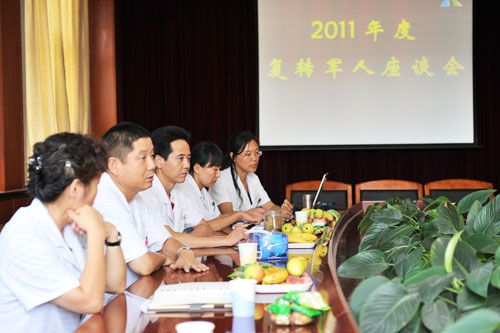 为庆祝中国人民解放军建军82周年,北京安定医院人事科、党办于8月10日下午组织召开了2011年度复转军人座谈会。十余名复转军人畅谈了军队的光荣传统和优良作风,讲述了自己在部队的成长历程和收获体会,表达了要继续发扬革命军人的优良传统投身医药卫生体制改革和医院跨越式发展建设的决心。院党委书记陈兴德、副院长李占江同志参加了座谈会。
