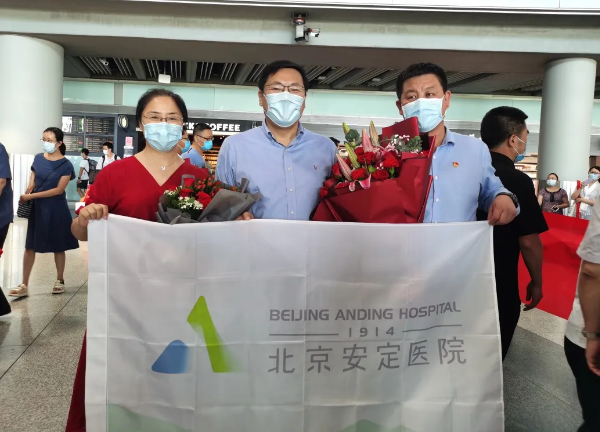 2020年8月13日,北京安定医院援藏干部薛立明结束为期一年零一个月的援助任务,随北京市属医院“组团式”援藏医疗队成员一道,平安返京。市医管中心副主任吕一平、医院副院长张骏、党办副主任王庆汝和薛立明的家人前往机场迎接。