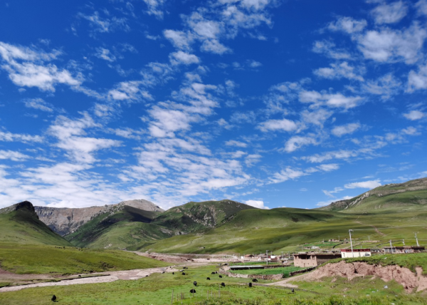 玉树雨后的天空更是晴空万里、碧空如洗,蓝蓝的天空上,飘着几朵白云,三五成群的牦牛如同黑珍珠般散落在这片高山草甸上,悠闲的吃着草,时不时抬头看一下过往的车辆,这大概就是很多人向往的“诗和远方”吧。大家也都感慨玉树景色的美丽,似乎忘记了路途的疲惫。