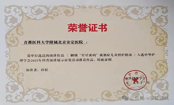 由我院护理团队精心打造的科普作品《解锁“星星密码”——孤独症儿童照护指南》,在中华护理学会“2025年科普演讲展示征集活动”中表现优异,成功入选推荐作品,并受邀在中华护理学会学术年会现场进行展示。